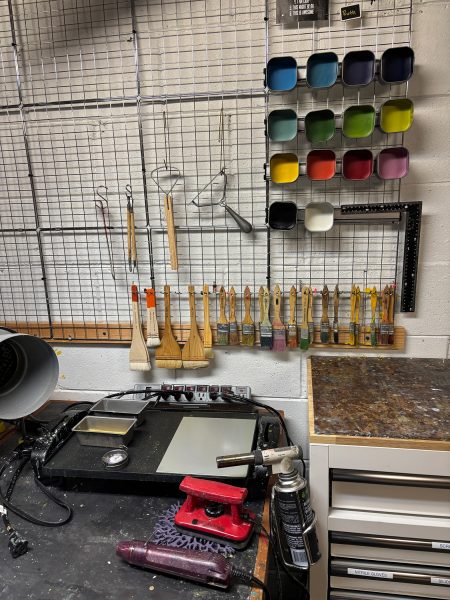 Encaustic paints in tins can be hung vertically on magnetic knife strips. Don’t leave the brush in the wax as it cools. It takes longer to melt encaustic paints with a brush in the tin. Metal tools can also hang on the knife strips. Encaustic paint tins also fit in the drawers of the tool chest.