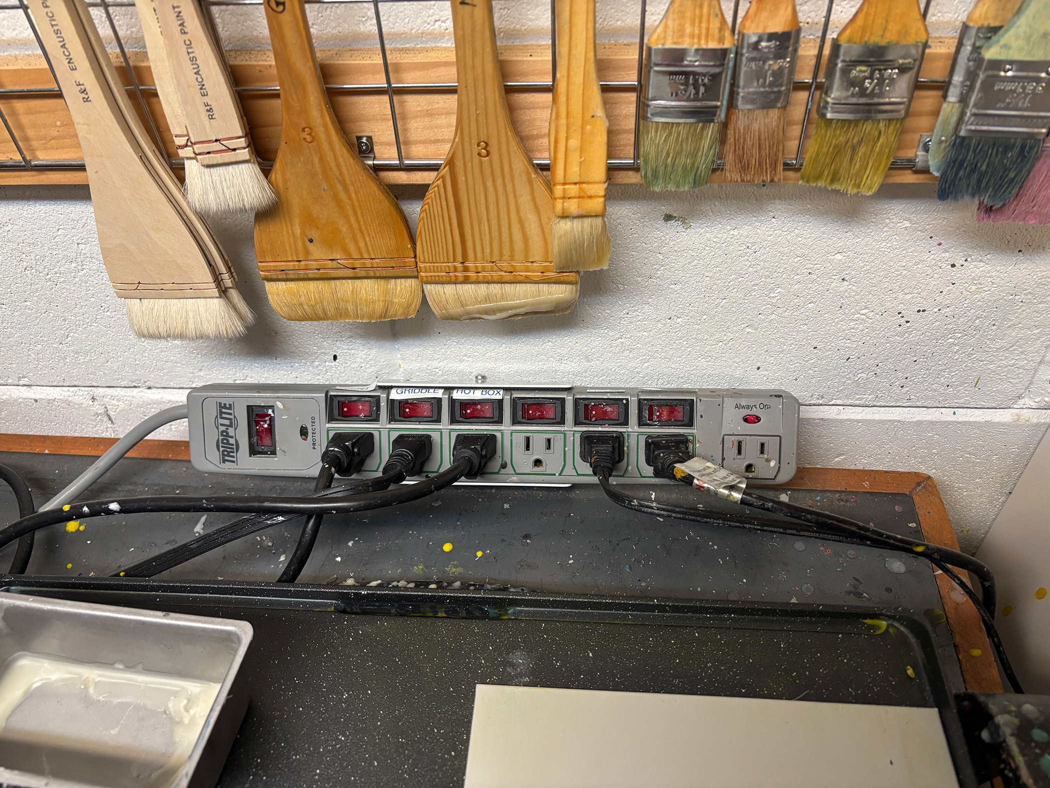 I organized the drawers of my tool chest with plastic drawer organizers that snap together. I use these for scraping tools, pigment sticks, brushes, and encaustic paints.