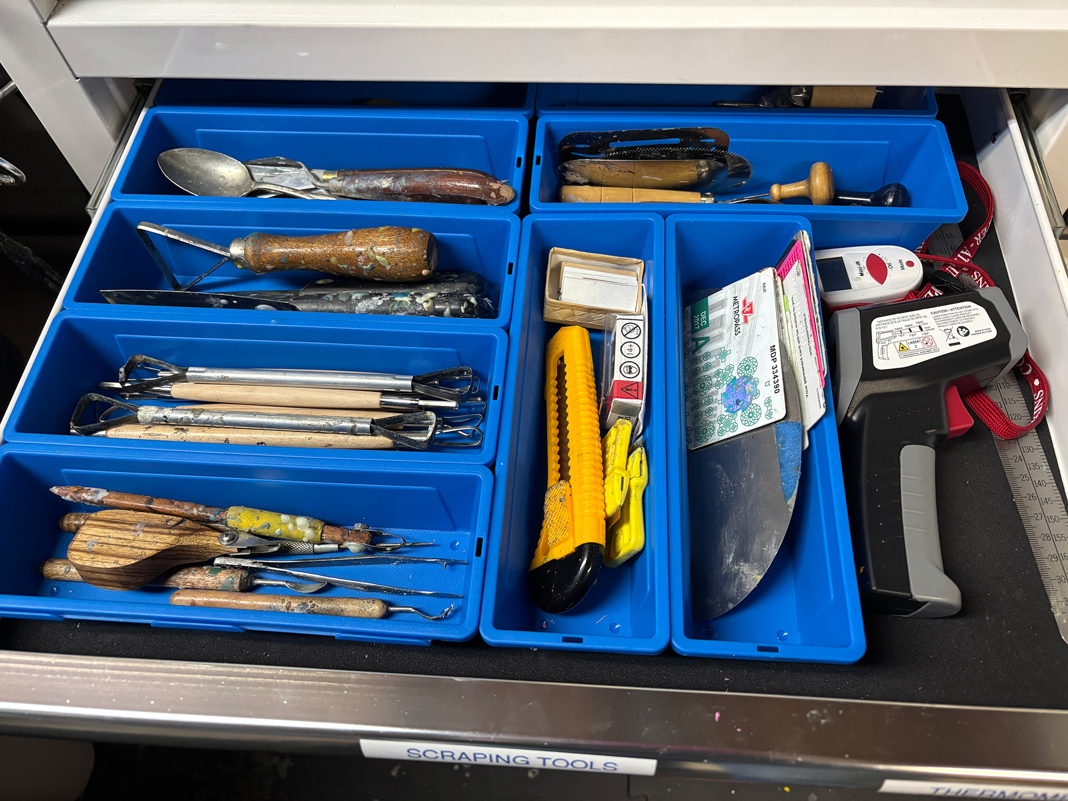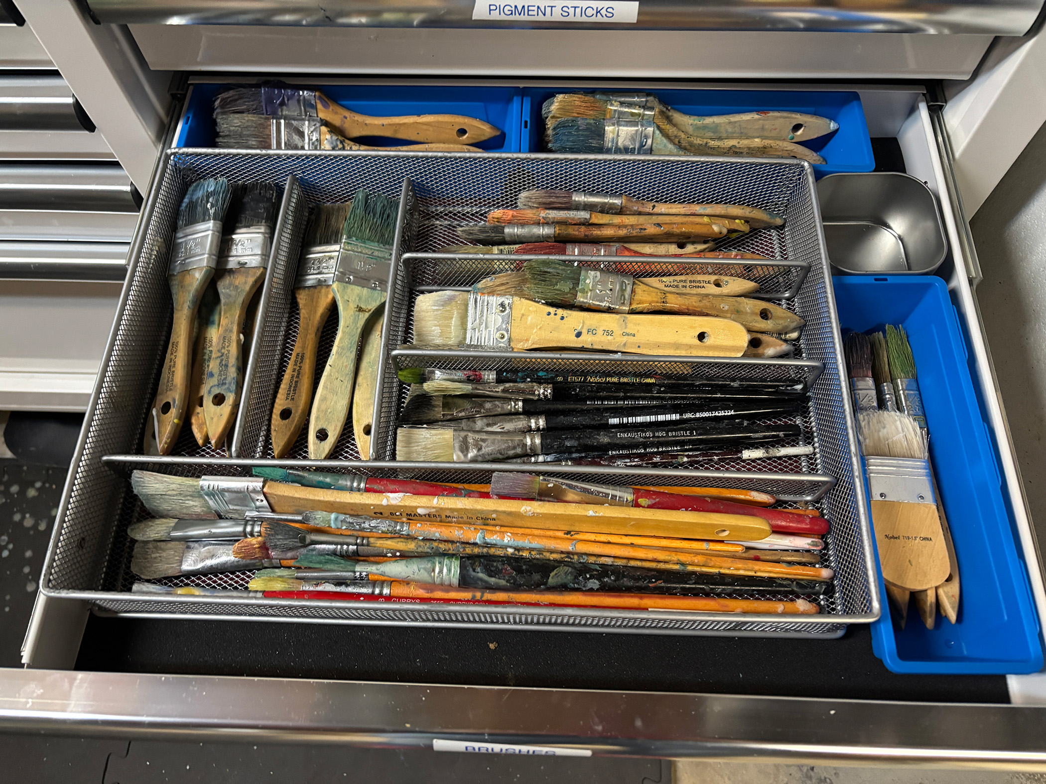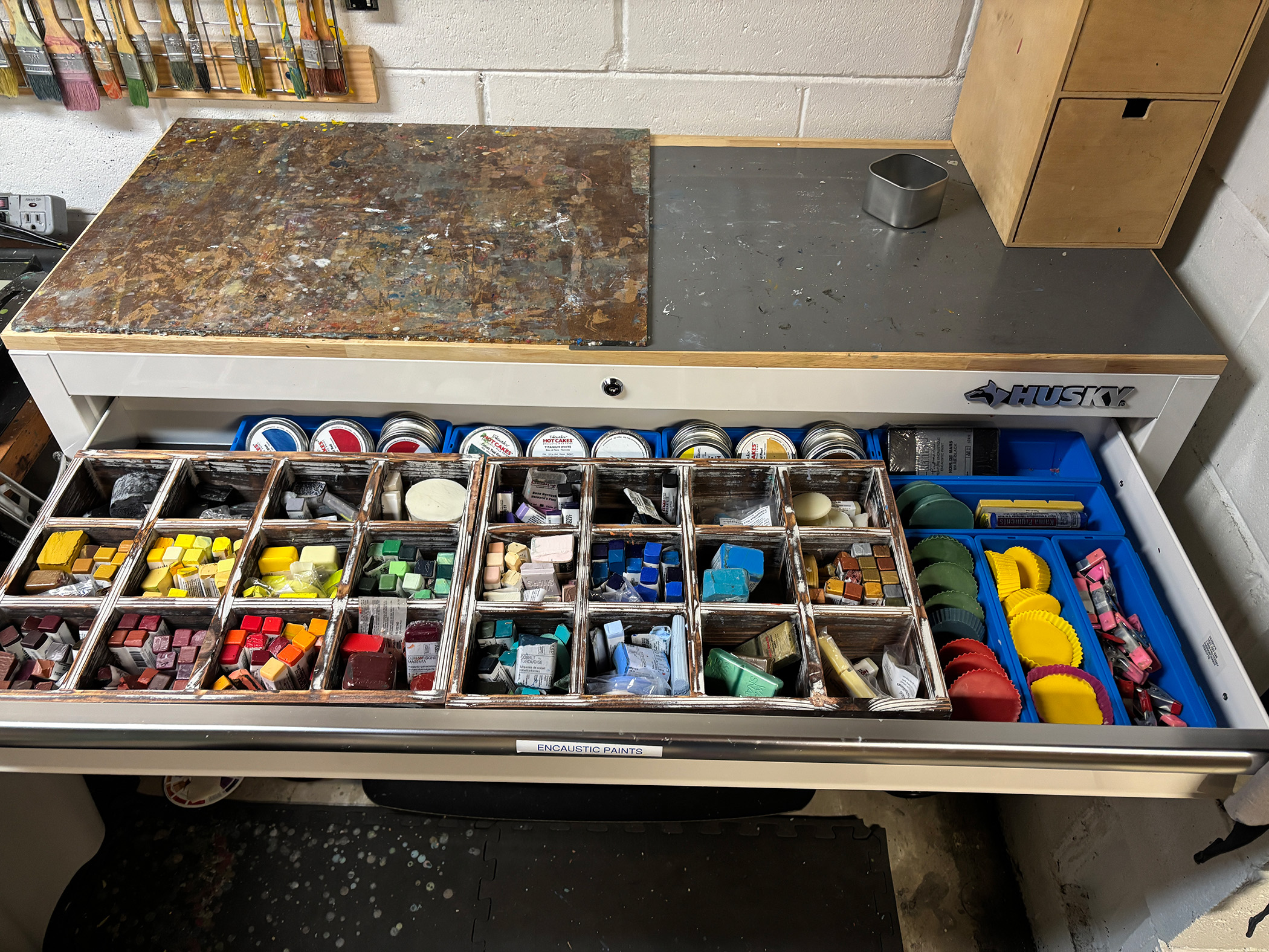 I organized the drawers of my tool chest with plastic drawer organizers that snap together. I use these for scraping tools, pigment sticks, brushes, and encaustic paints.