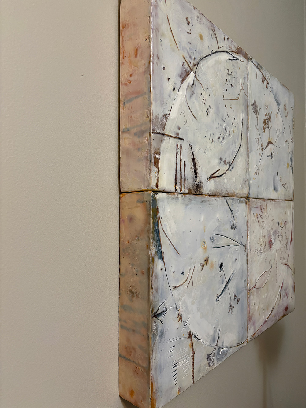 Encaustic, by its nature, pulls us–as artists, into new territory. This is one of the aspects of it that I love. There is a sense that the medium is always at least one step ahead of us, gesturing playfully to “Check this out!” or “What would happen if…?” At the beginning of my exploration with encaustic, I was not surprised by this, as with any new medium, the possibilities feel endless.